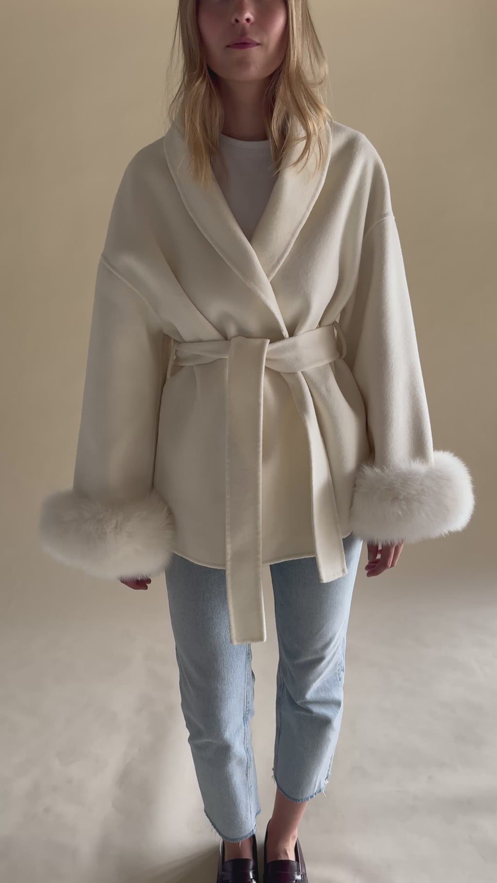 The Andermatt coat is cut from our signature double-faced cashmere blend fabric and featuring detachable fox fur details on the sleeves. This coat will fit to whatever you are wearing, whether you are going to the office or going out for dinner, you can never go wrong with this gorgeous coat. You can tie this coat on the waist, to keep you warm, or you can leave it open for a more relaxed look. As always, the fox fur details are removable, so you can throw this coat on, even on summer nights.