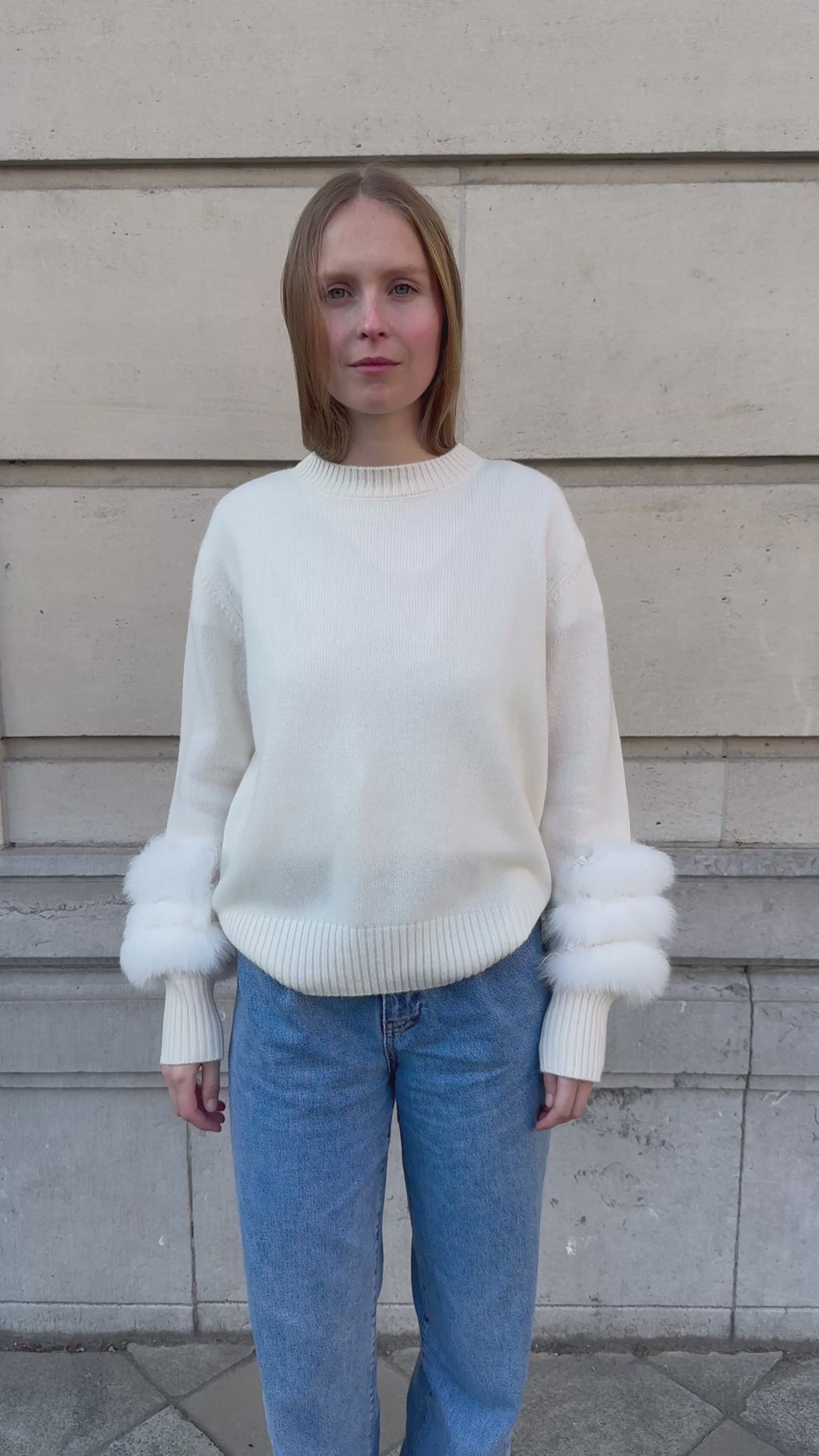 Round-neck sweater made from soft, fluffy baby cashmere yarn. This minimalist style is enhanced by an intarsia knit, while a lightweight weave and dropped armholes emphasize its draped, slightly oversized fit. The detachable fox fur details at the sleeves provide a chic and original twist.